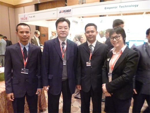 在會議的另一邊,是我公司安全ID產品線的技術工程師與國際部人員在麻豆传媒下载科技的展位上宣傳此次參展的設備:電子護照個人化設備JC8000與IC卡個人化設備EMP-8900,展位前人流如織。